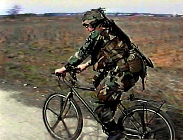 The Paratrooper 2000 cycles quickly off the DZ using the 10-25 mile per hour mobility of the folding All-Terrain "Mountain" Bike. He is wearing a mesh tactical load bearing vest (TLBV) that interestingly enough was offered to Army/mc Research & Development officials BEFORE the TLBV with non-breathing solid material construction was bought in massive quantities. Later on, troops en masse had to complain and provide massed statistical "data" that the TLBV was hot to force an "Enhanced TLBV" with mesh to be fielded when COMMON SENSE should have been enough to ANTICIPATE these truths. A major benefit of ATB-mobility is that Light Bicycle Infantry (LBI) can traverse great distances quickly at reduced levels of exertion and sweat, thus consuming less food (MREs) and water.