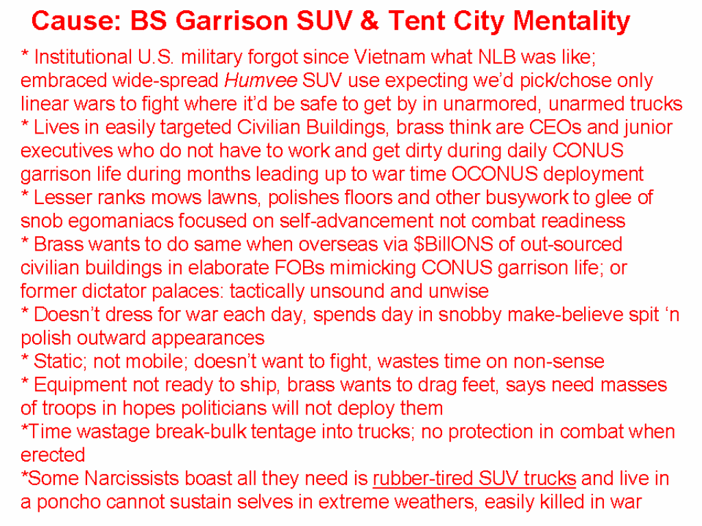 The military brass should stop accepting civilian building pork/bribe money and demand that these funds be used to put ourselves into ISO container Battle Boxes and onto lands we can train on free from eco-nazis (ITAM) wanting to save a handful of woodpeckers when if we do not field an effective military an enemy nuclear attack is going to harm the environment 1,000,000 times more.