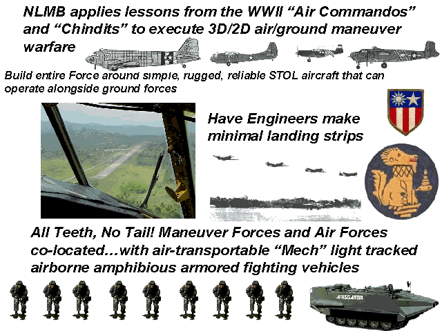 Like the CHINDITS, the NLMB will be capable of "Expeditionary Dispersed Operations" (EDOs) by their M113 Gavin tracks with bulldozers scraping out runways for their aircraft to land, followed by spraying Rhino Snot sealant to prevent "brown-outs" from causing crashes and keep dirt/sand out of engines and troop living areas.