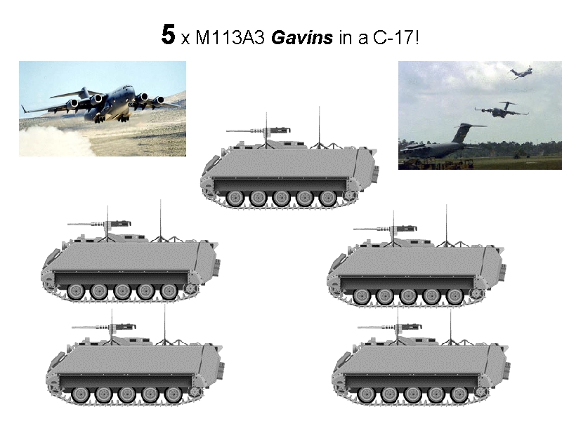 NEW! 173rd Airborne Brigade does exactly this: flies in 15 x M113A3 Gavins to deliver a mechanized infantry medium ready company to Northern Iraq Details: SETAF's Immediate Ready Forces All the World's Airborne Operations