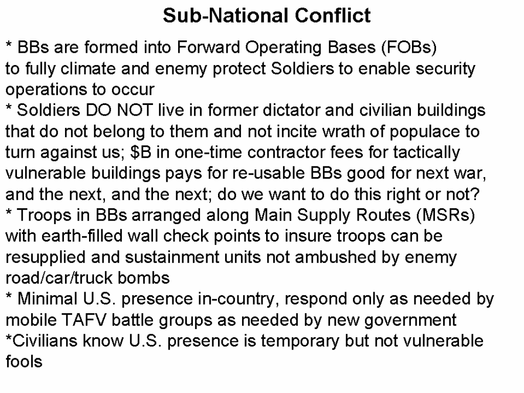 "...as field housing instead of a 'tent city', they are the bomb. Sturdier than tents, able to be armed and armored, able to be climate controlled where needed, sealed against the environment (like sand), etc. In places where underground bunkers would be used, you bury them with 'cut and cover' contruction -- beats the hell out of local lumber and sandbags. Your generators can be protected from sand, animals, and thieves. As you have said, you can make a fort wall by filling them with dirt (I would partition them lengthwise, fill the outboard side with dirt, and use the inboard side for covered access to the topside weapons/guard stations. If 4' of packed dirt in a steel shell won't significantly slow down a kinetically driven round or detonate a HEAT round, 8' probably isn't going to help either.)