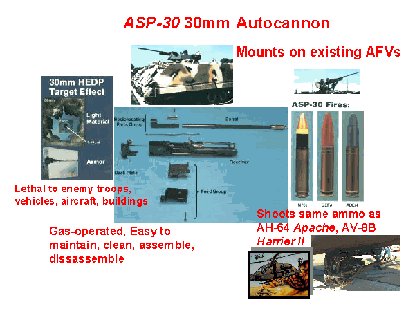 We need a lightweight GAS-OPERATED 30mm autocannon that can be rapidly removed and attached so a BV-206S can roll-on/roll-off inside a CH-47D helicopter. Ditto that for a M113A3 Gavin rolling on/off a C-130 Hercules STOL fixed-wing aircraft to include parachute airdrop procedures. The ASP-30mm can be dismounted and fired on a tripod, an important capability for light Air-Mechanized Infantry to get the best defensive and ambush positions possible. The electrically-operated 30mm weapons ATK makes will NOT DO for the helicopter-transportable light tracked AFV with a CH-47 internal loading constraint.